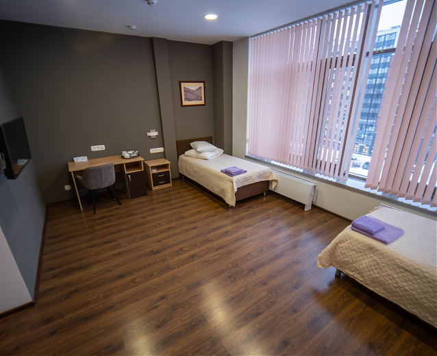 В каждом номере: односпальная кровать и прикроватная тумбочка, туалетный столик с зеркалом, шкаф с полочками и штангой, платяной шкаф с багажной полкой, стол и 2 стула, совмещенный санузел, 2 полотенца, туалетные принадлежности, фен, внутренняя телефонная связь ФНС России, телевизор, холодильник, чайник, посуда, утюг и гладильная доска.